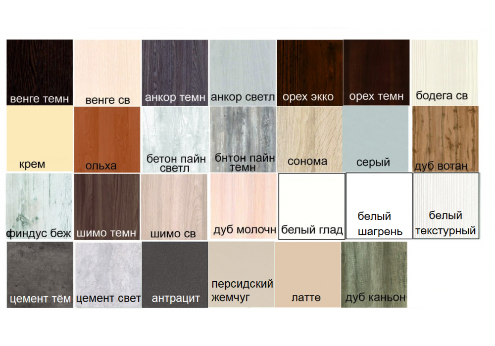 Стандартные цвета:  белый, дуб сонома, ясень шимо тёмный, ясень шимо светлый, яблоня, орех лесной, ольха, бук, вишня, венге темный, орех темный,дуб молочный, светлый венге.
